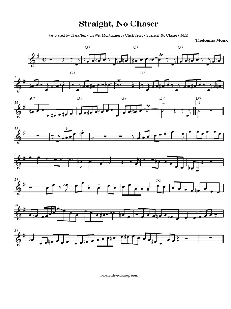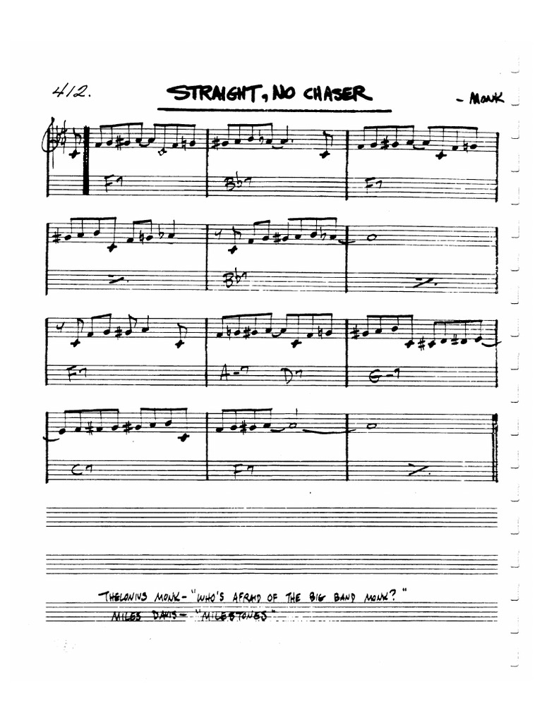It was first recorded on monk's blue note sessions in 1951. As always, we've included a chord reference sheet with some voicings using extensions for you to further your comping ability over this tune. Download and print in pdf or midi free sheet music for straight no chaser by miles davis arranged by walk that bass for piano (jazz band). Download and print straight no chaser by thelonious monk.